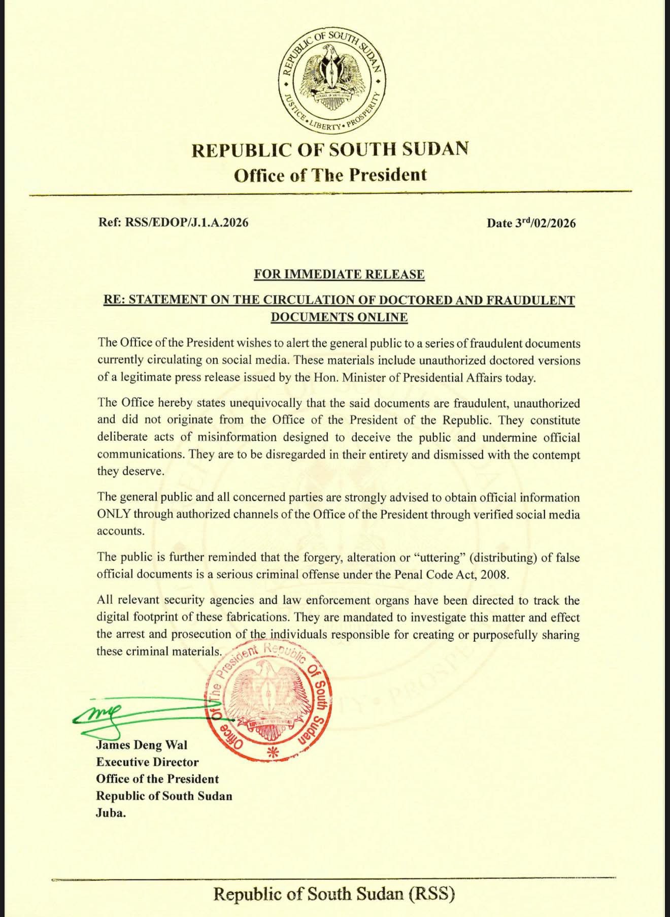 The Office of the President of the Republic of South Sudan has issued an official statement warning the public about the circulation of doctored and fraudulent documents on social media platforms.